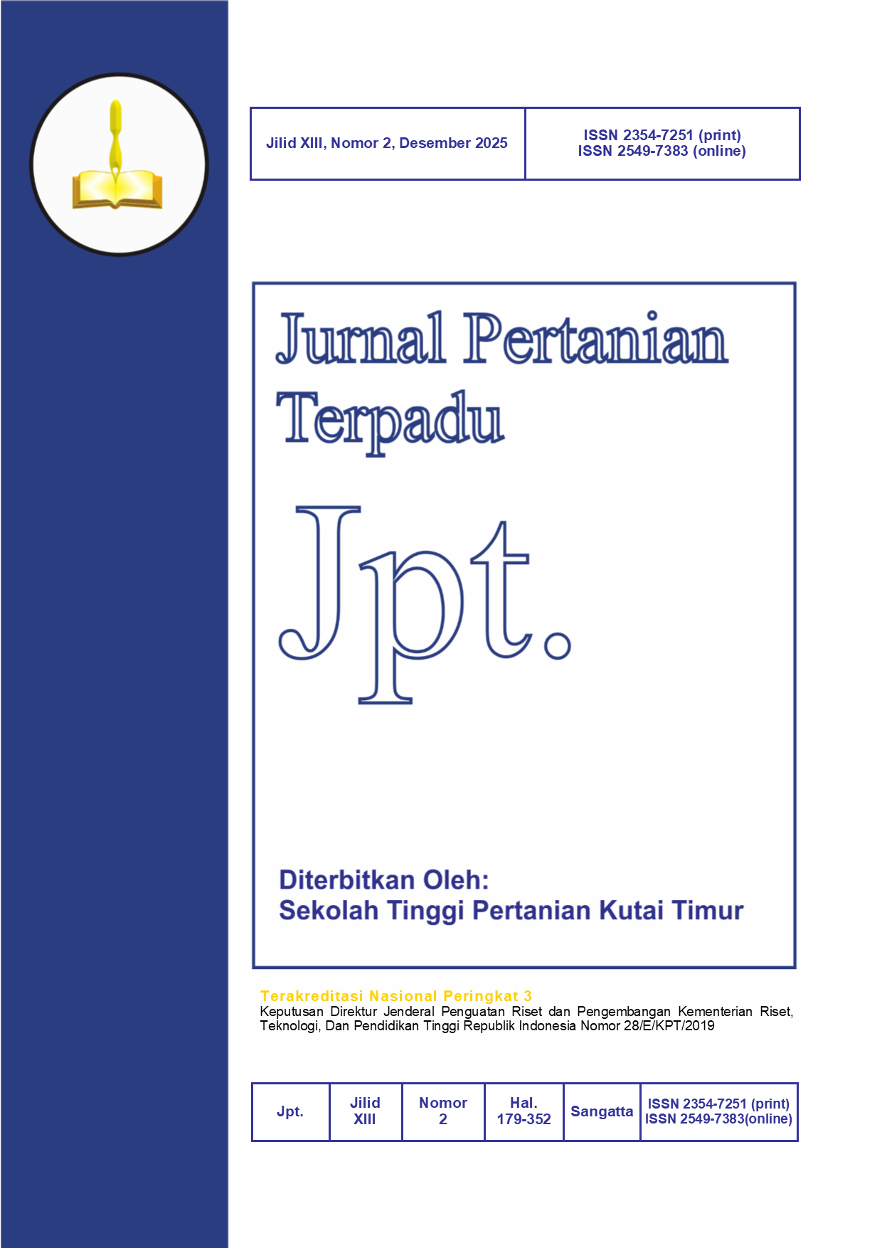 Berdasarkan Surat Keputusan Direktur Jenderal Riset dan Pengembangan, Kementerian Pendidikan Tinggi, Sains. dan Teknologi Nomor 10/C/C3/DT.05.00/2025 tentang Peringkat Akreditasi Jurnal Ilmiah Periode I Tahun 2025 tanggal 21 Maret 2025 Jurnal Pertanian Terpadu terakreditasi peringkat 3 dan terindeks sinta 3 sejak Volume X No 1 tahun 2022, terhitung mulai bulan Juni 2022 hingga Volume XIV No 2 tahun 2026.